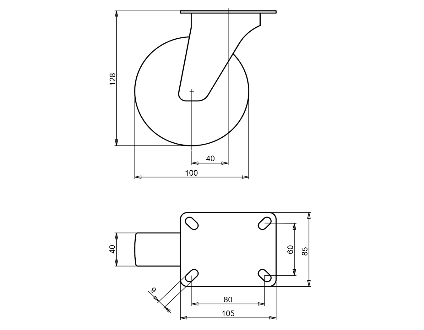 Zgornja plošča s 4 pritrdilnimi luknjami 9 mm, razdalja namestitvene luknje80x60 mm zunanje mere zgornje plošče: 105x85 mm