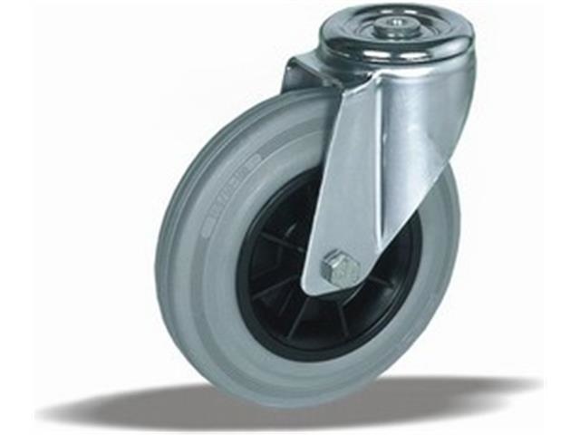 Wheel with roller bearing and grey rubber tyre with hardness 83 ° Shore A on polypropylene.
