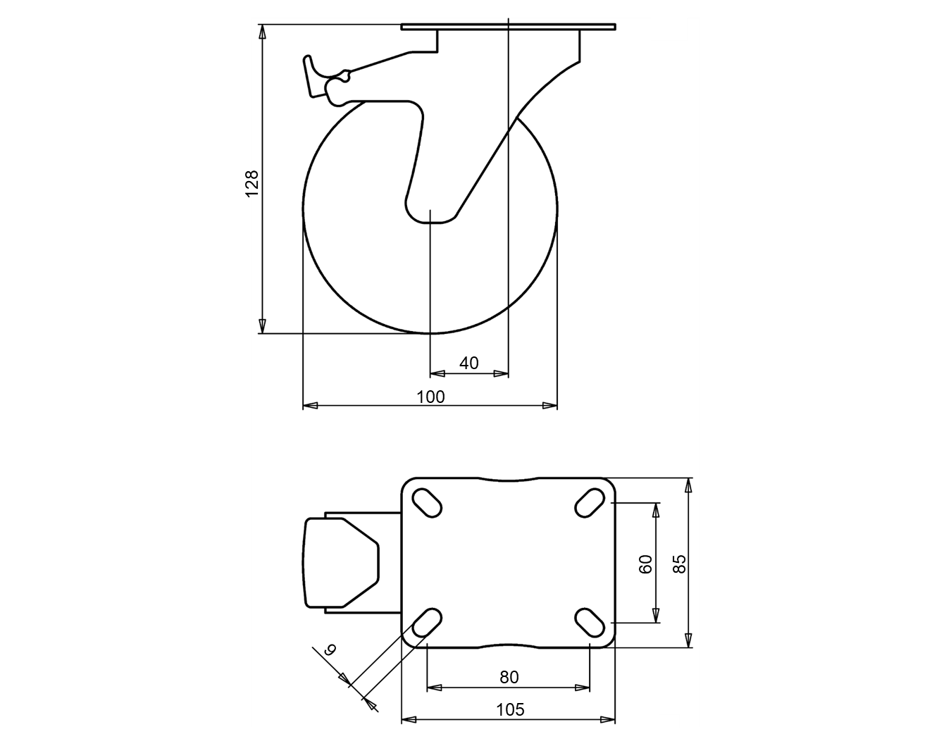 ID 42183: Castor overall height 128 mm | 4 mounting holes with distance 80x60 mm | Wheel w...