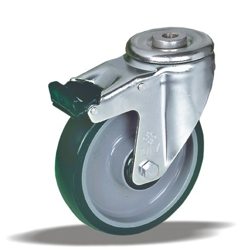 stainless steel Swivel castor with brake + injection-moulded polyurethane tread Ø200 x W50mm for 300kg Prod ID: 42215
