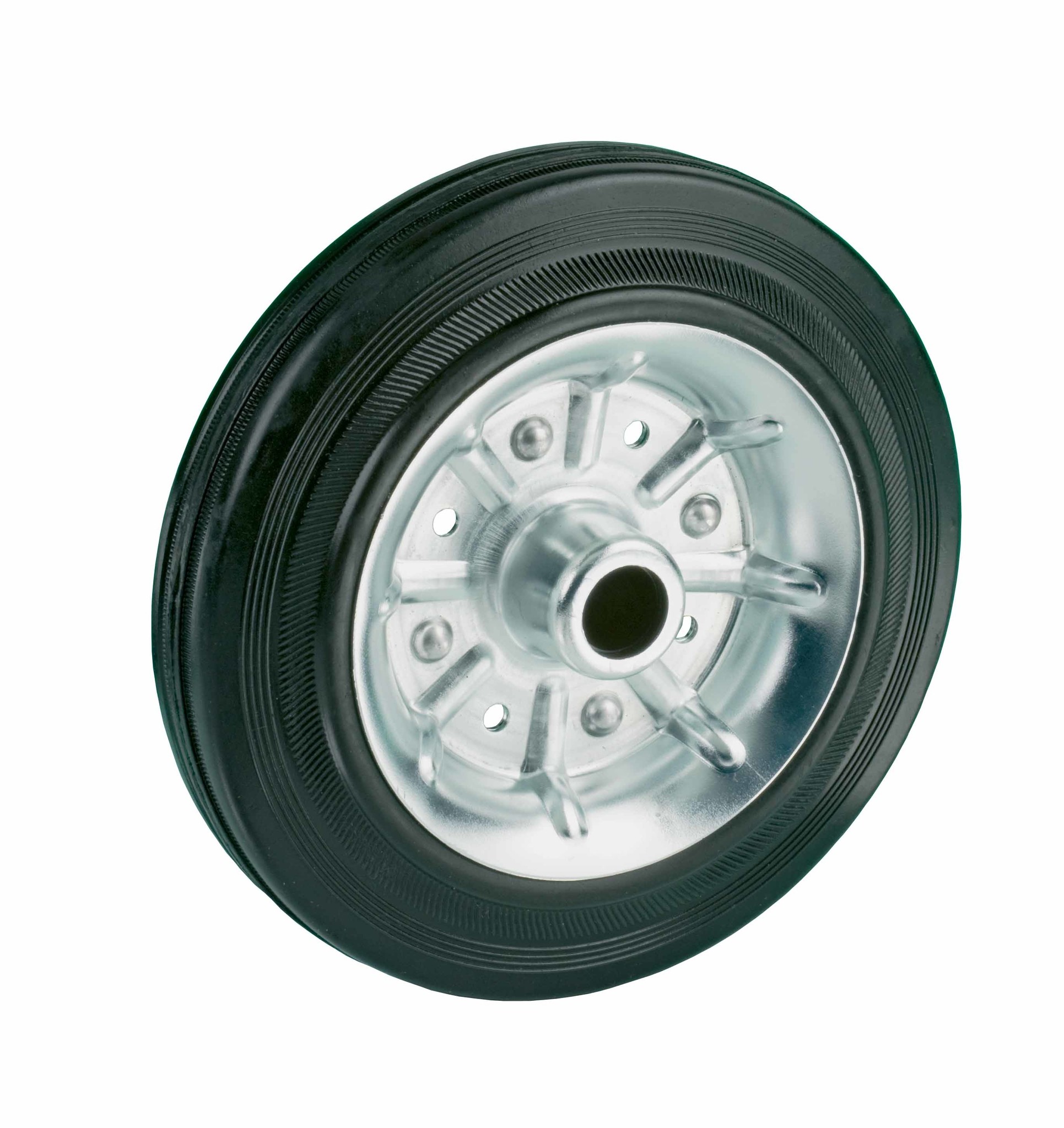Estándar rueda con cojinete liso y 80 ° Shore A neumático de goma negro en llanta de acero con recubrimiento de electrocincado protección anticorrosiva sin Cr6