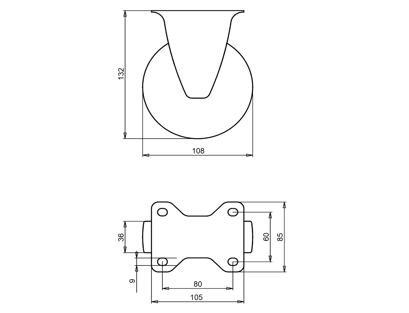 Fixed castor + solid polyamide wheel Ø108 x W36mm for 200kg Prod ID: 91800